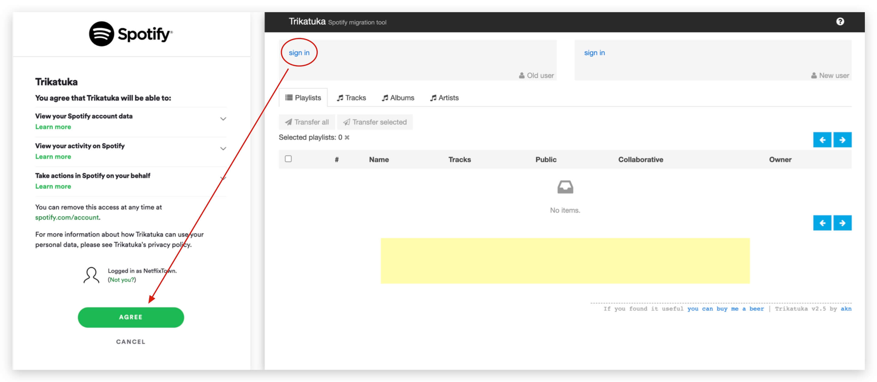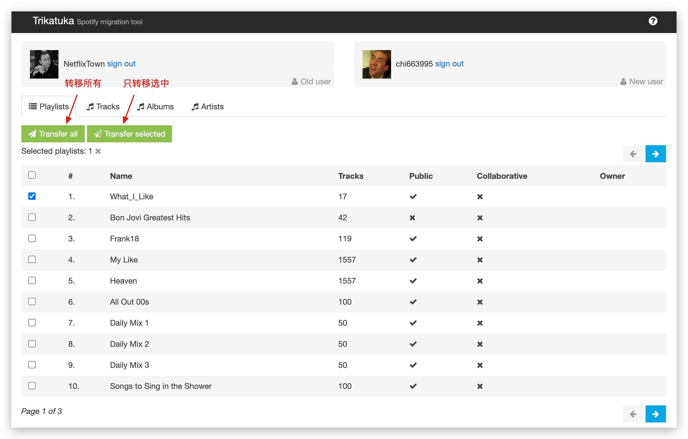 使用工具 http://www.trikatuka.aknakn.eu/#/ 可以很轻松的将Spotify的歌单、曲目等在账号之间转移