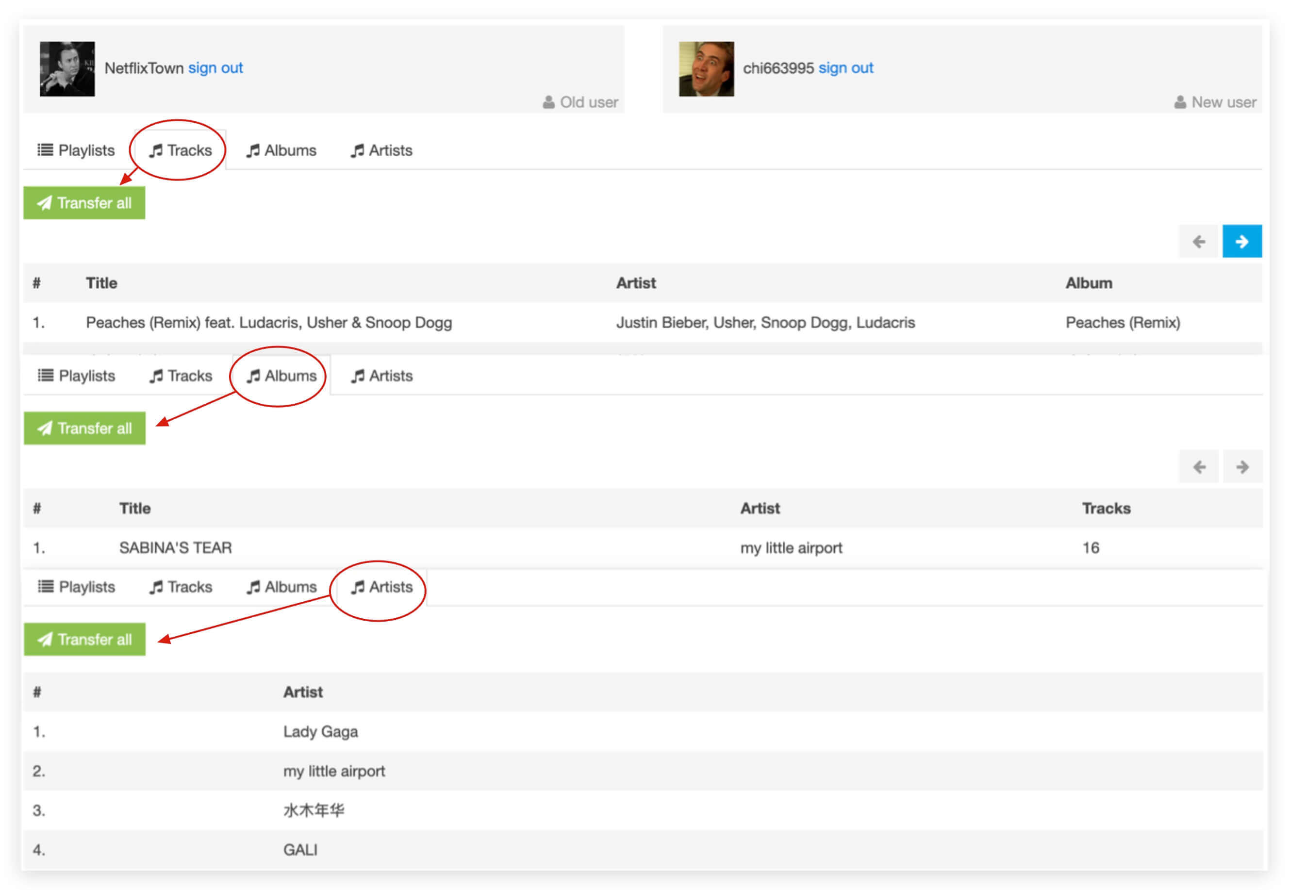 ⑦ 转移 Tracks、Albums、Artists