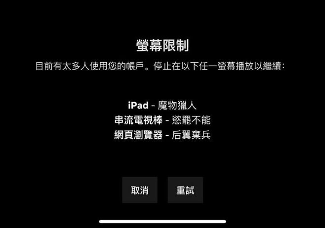 - AER 合租账号所订阅的高级套餐,最多允许 3台相同设备同时播放,每个账号为最大化资源利用率设有 5 个座位,因此是有一定概率碰到这种情况的
